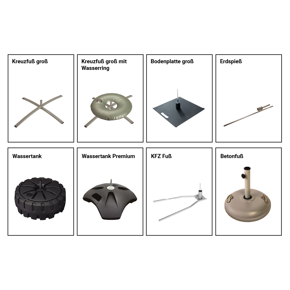 Damit die Fahne stabil und sicher steht – egal ob auf Asphalt, Rasen, Sand oder Schnee - ist die Wahl des richtigen Standfußes entscheidend. Für die Beachflag Drop sind verschiedene Kreuzfüße, Bodenplatten, ein Wassertank, ein KFZ-Fuß und ein Betonfuß erhältlich, wenn die Fahne auf den Boden gestellt werden soll sowie ein Erdspieß für die Verankerung im Boden. Bei Kreuzfüßen und Bodenplatten empfiehlt es sich je nach Einsatzort und Größe der Beachflag, für eine optimale Stabilität einen Wasserring zur Beschwerung zu verwenden.